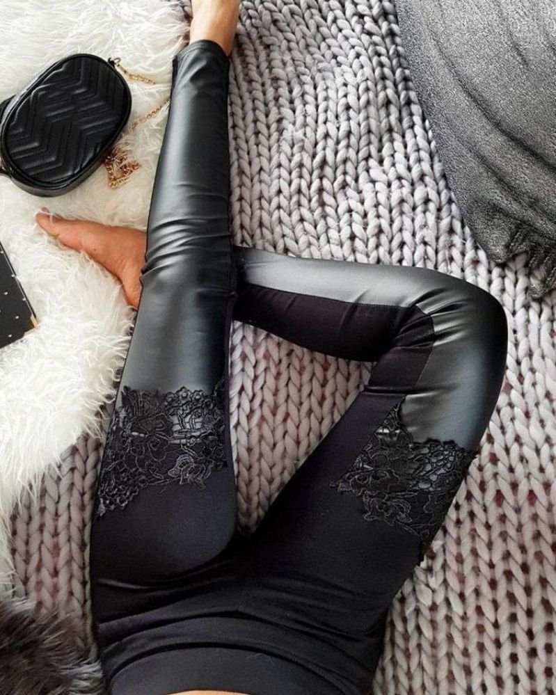 Floral Applique Coated PU Insert Pants