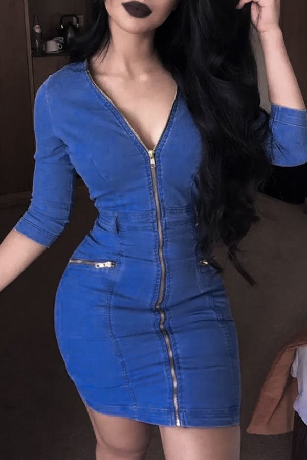 Lovely Casual V Neck Zipper Design Deep Blue Mini Dress