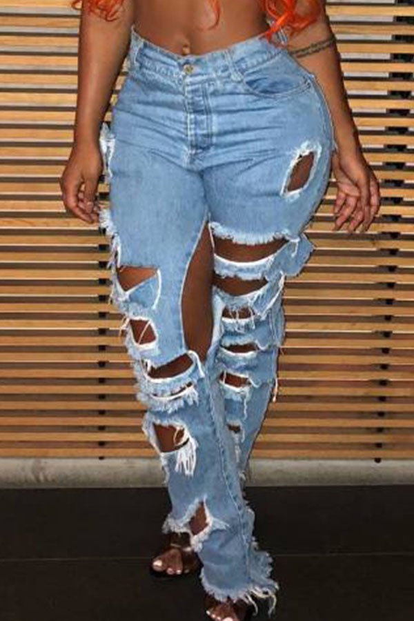 Lovely Casual Broken Holes Baby Blue Denim Jeans