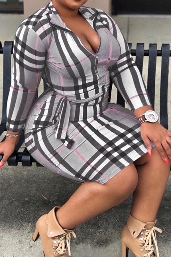 Lovely Casual Plaid Printed Grey Plus Size Mini Dress