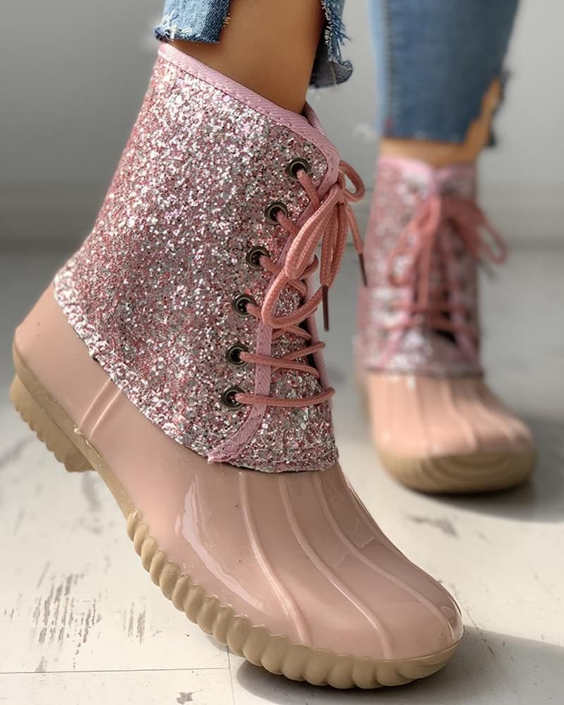 Eyelet Lace-Up Sequins Flat Ankle Boots