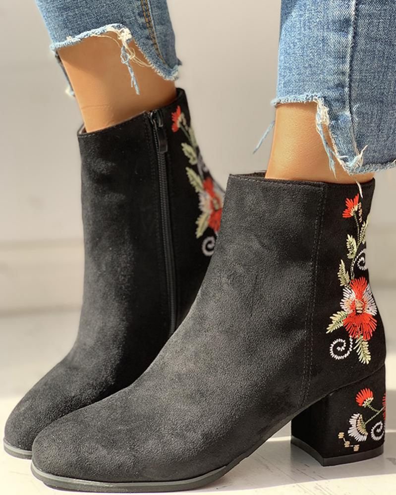 Flower Embroidery Zipper Chunky Heeled Boots