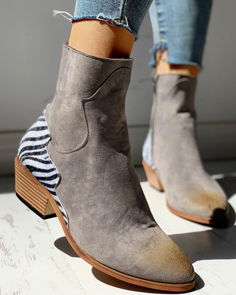 Pointed Toe Zipper Zebra Print Chunky Heeled Boots