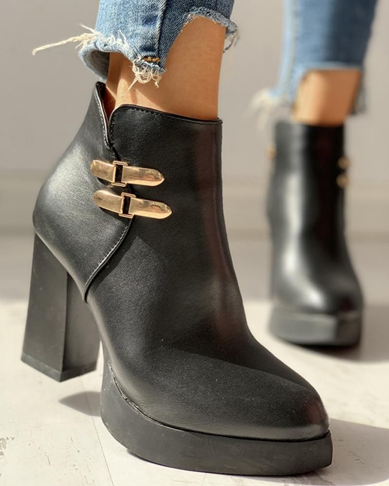 PU Ankle-Buckled Pointed Toe Chunky Heeled Boots