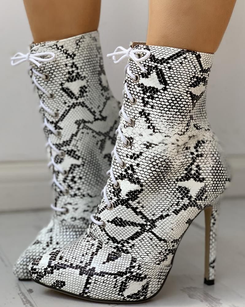 Snakeskin Print PU Pointed Toe Thin Heeled Boots