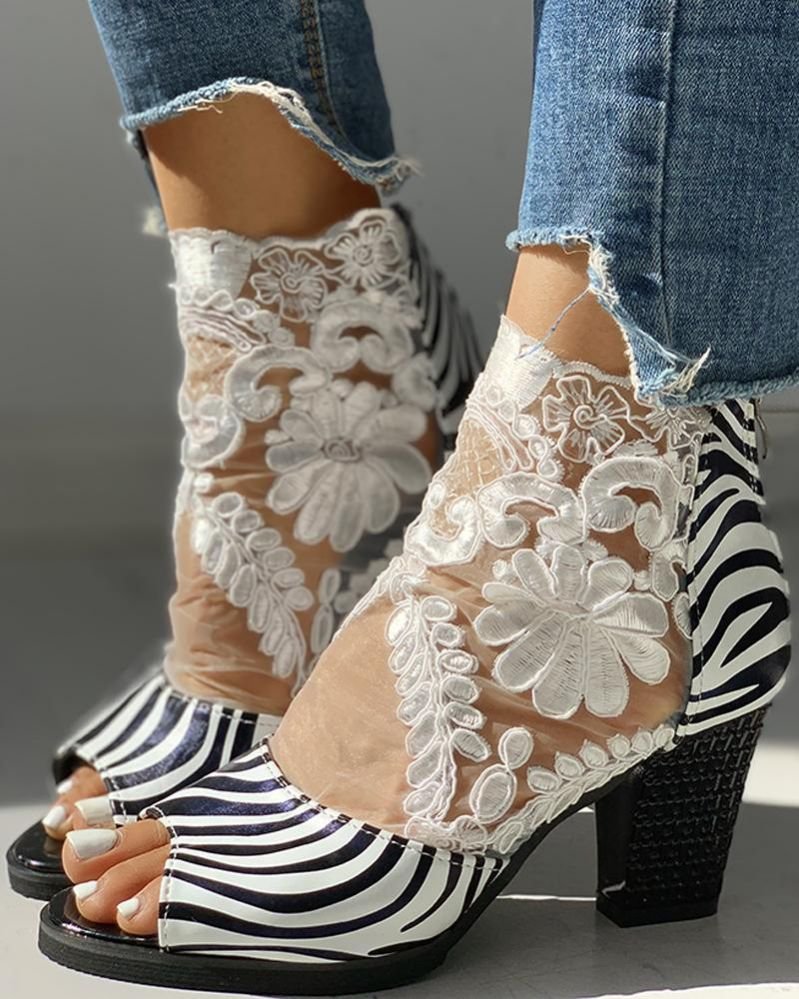 Zebra Embroidery Peep Toe Chunky Heeled Boots